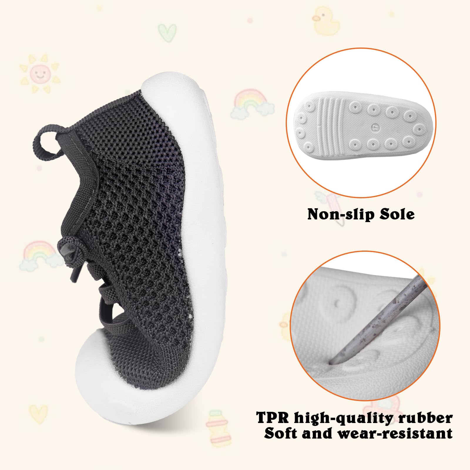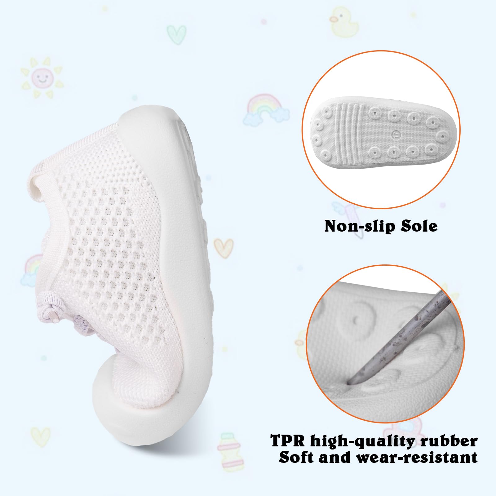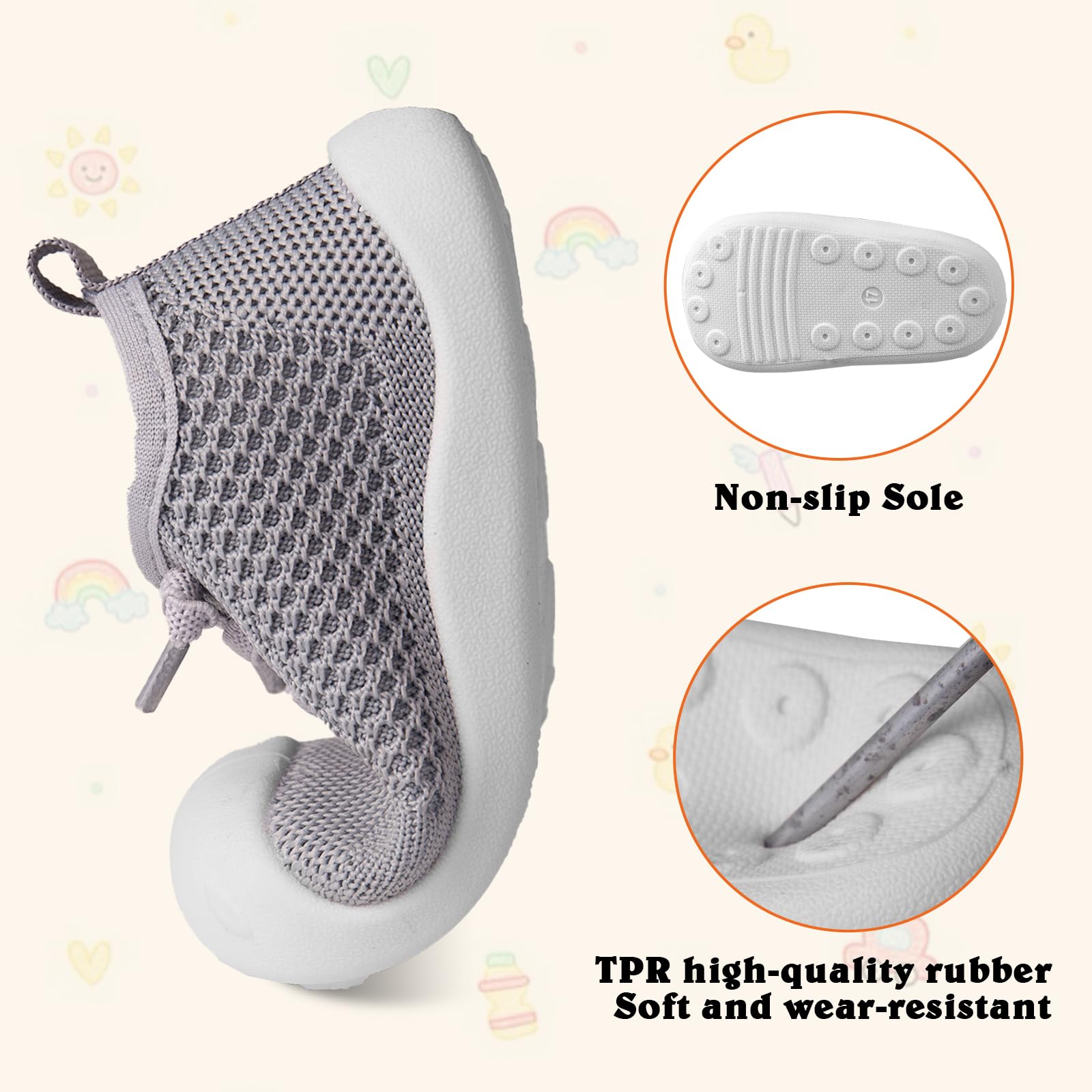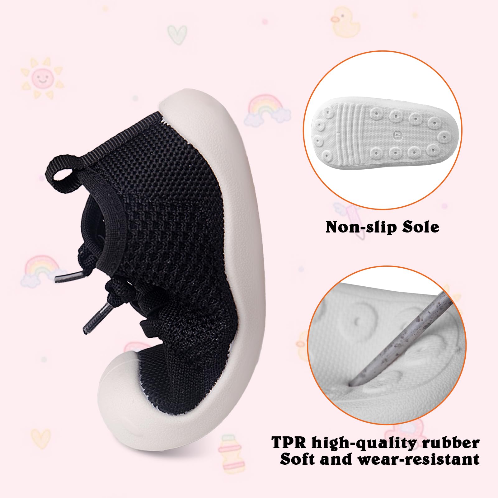 - Breathable and Safe for All-Day Comfort: Keep baby's feet cool and comfortable with the knitted cotton upper.TPR outsoles offer excellent traction and support,indoors and outdoors.Breathable material helps prevent odor,ensuring fresh and safe feet