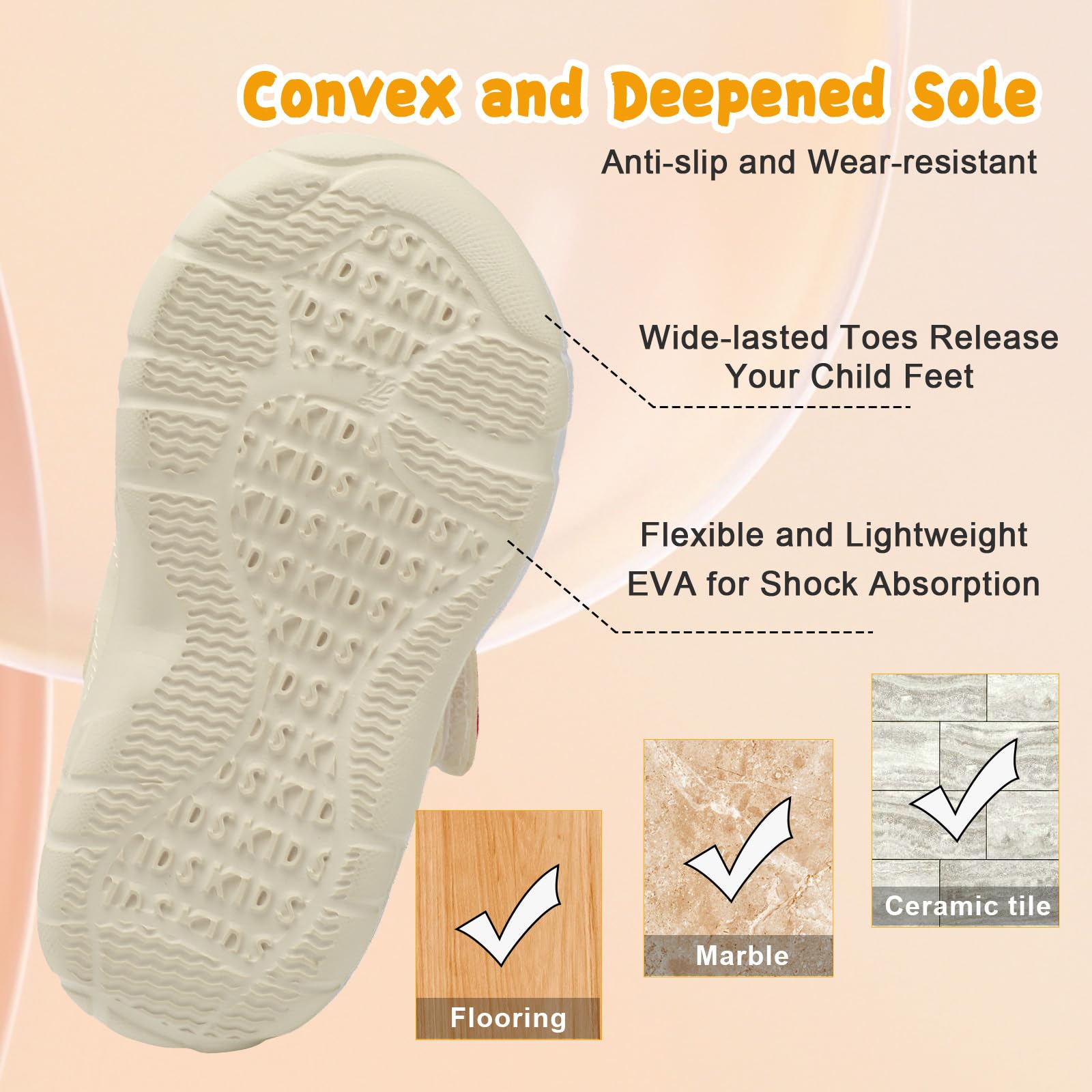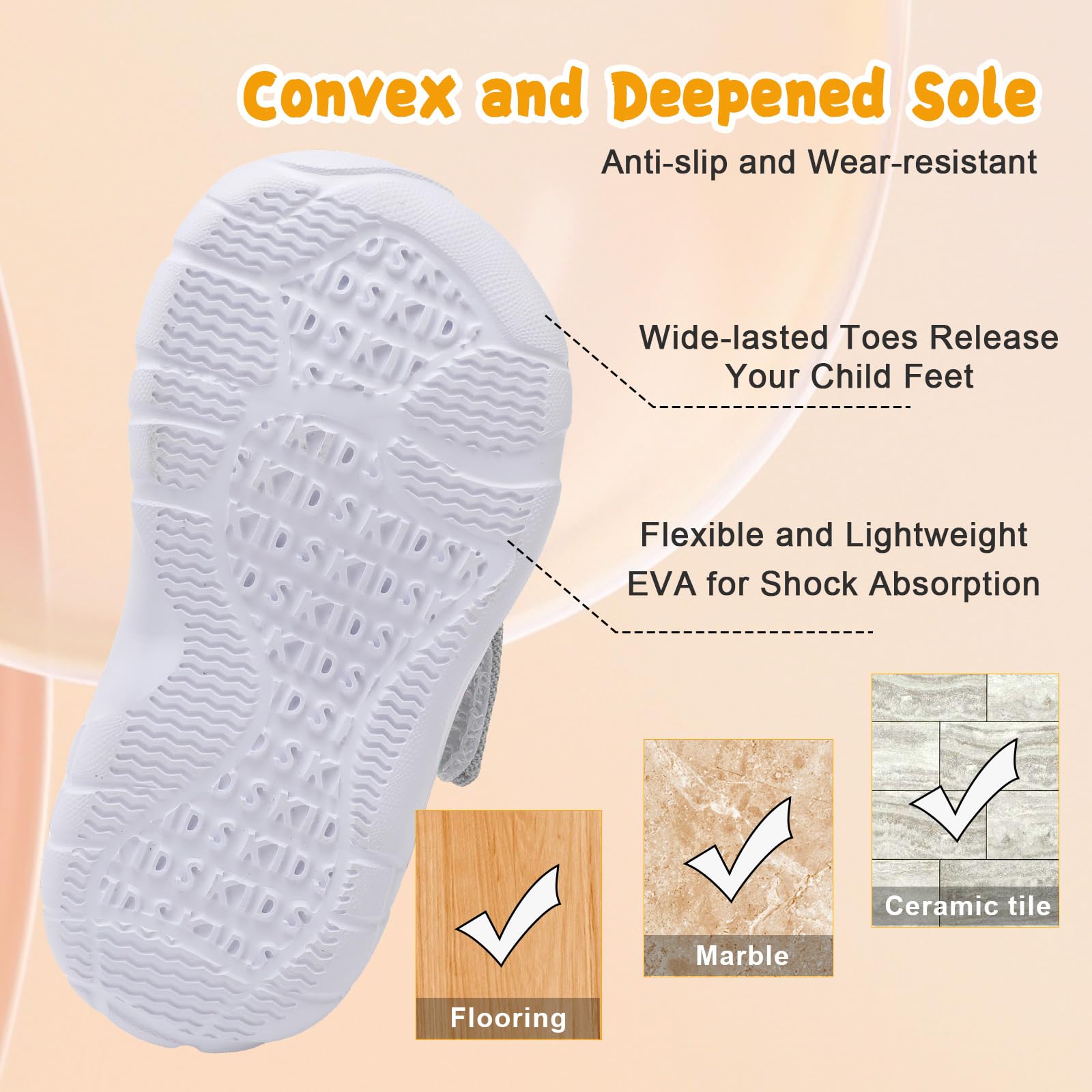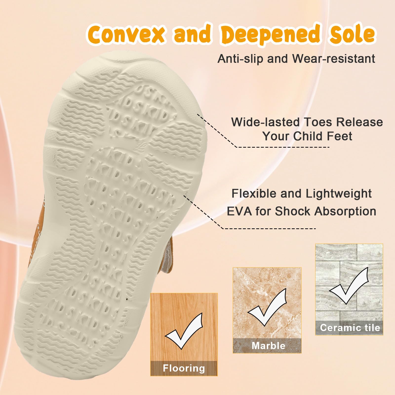 - Wearable Sole: Durable EVA outsole features stronger traction and wear-resistance,avoid your child from slipping, help baby learn balance as their toes grip the ground. Thickened honeycomb structure insole, add more comfortable when walking or running
