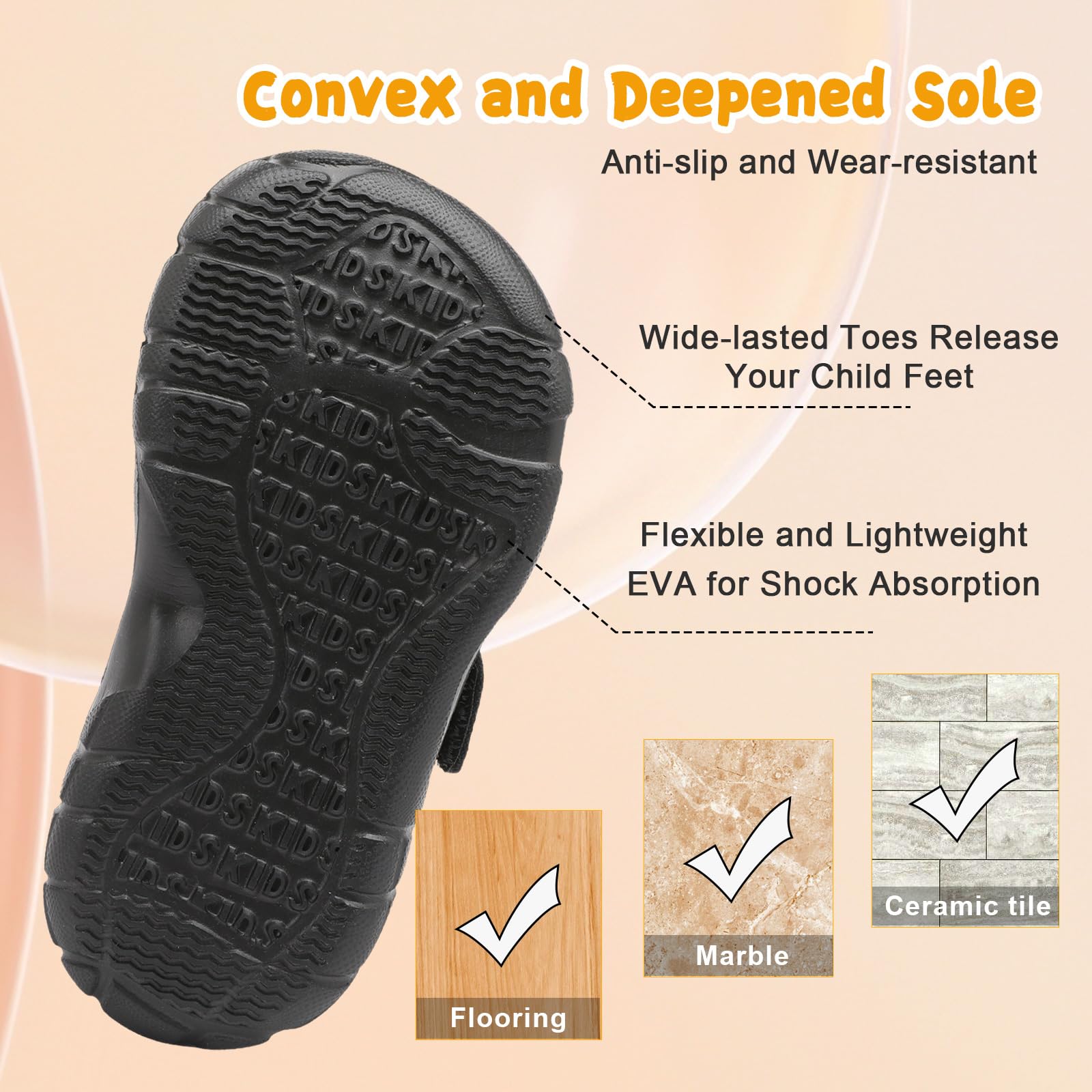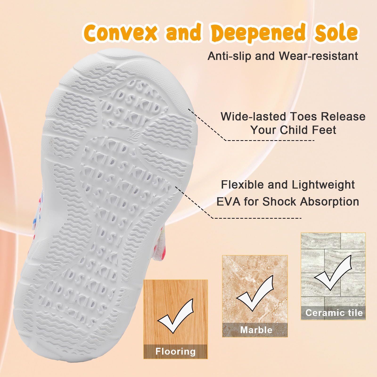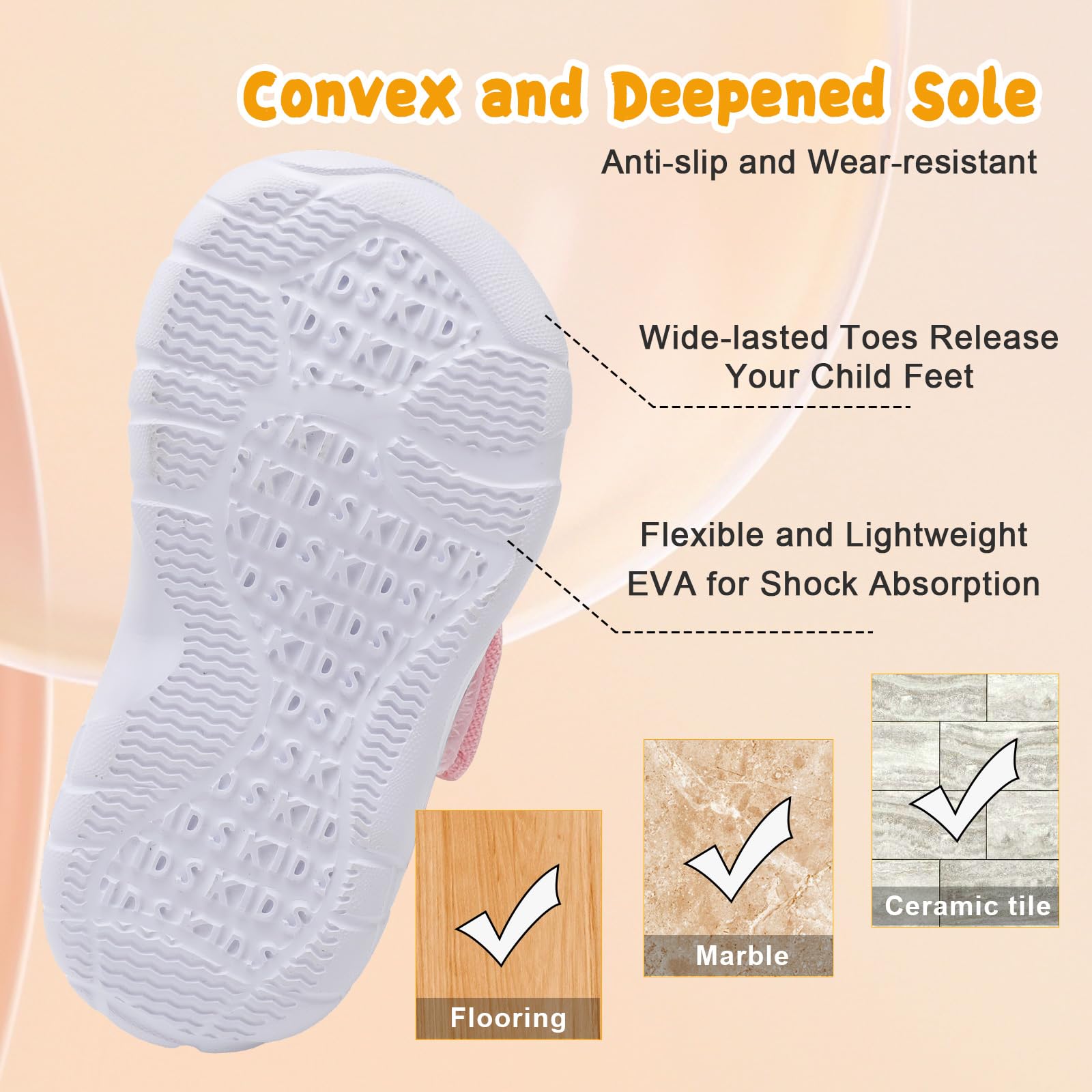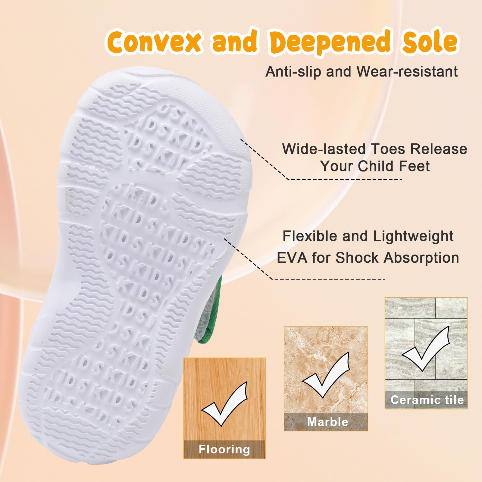 - Wearable Sole: Durable EVA outsole features stronger traction and wear-resistance,avoid your child from slipping, help baby learn balance as their toes grip the ground. Thickened honeycomb structure insole, add more comfortable when walking or running