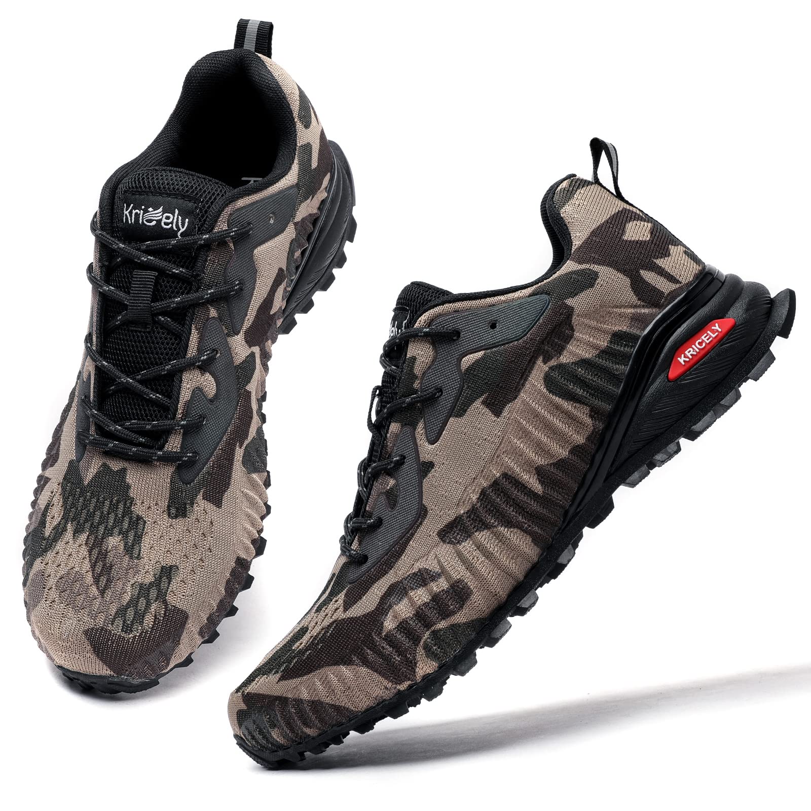 - Very Stylish:The outdoor walking shoes contains camouflage,black and red colors, it makes this trail running shoes more attractive.Camo Fashion sneaker for men is a good choice for many outdoor enthusiasts.