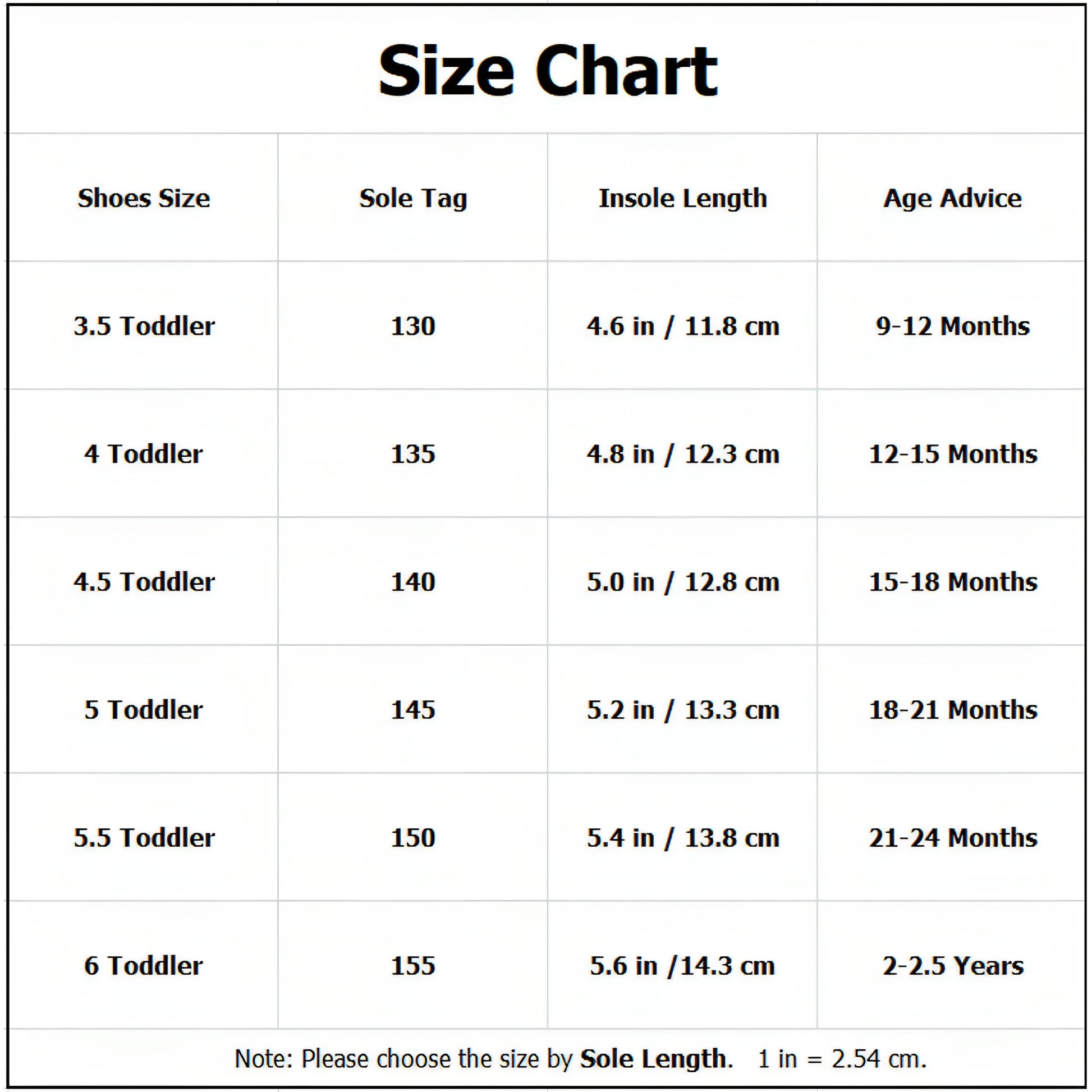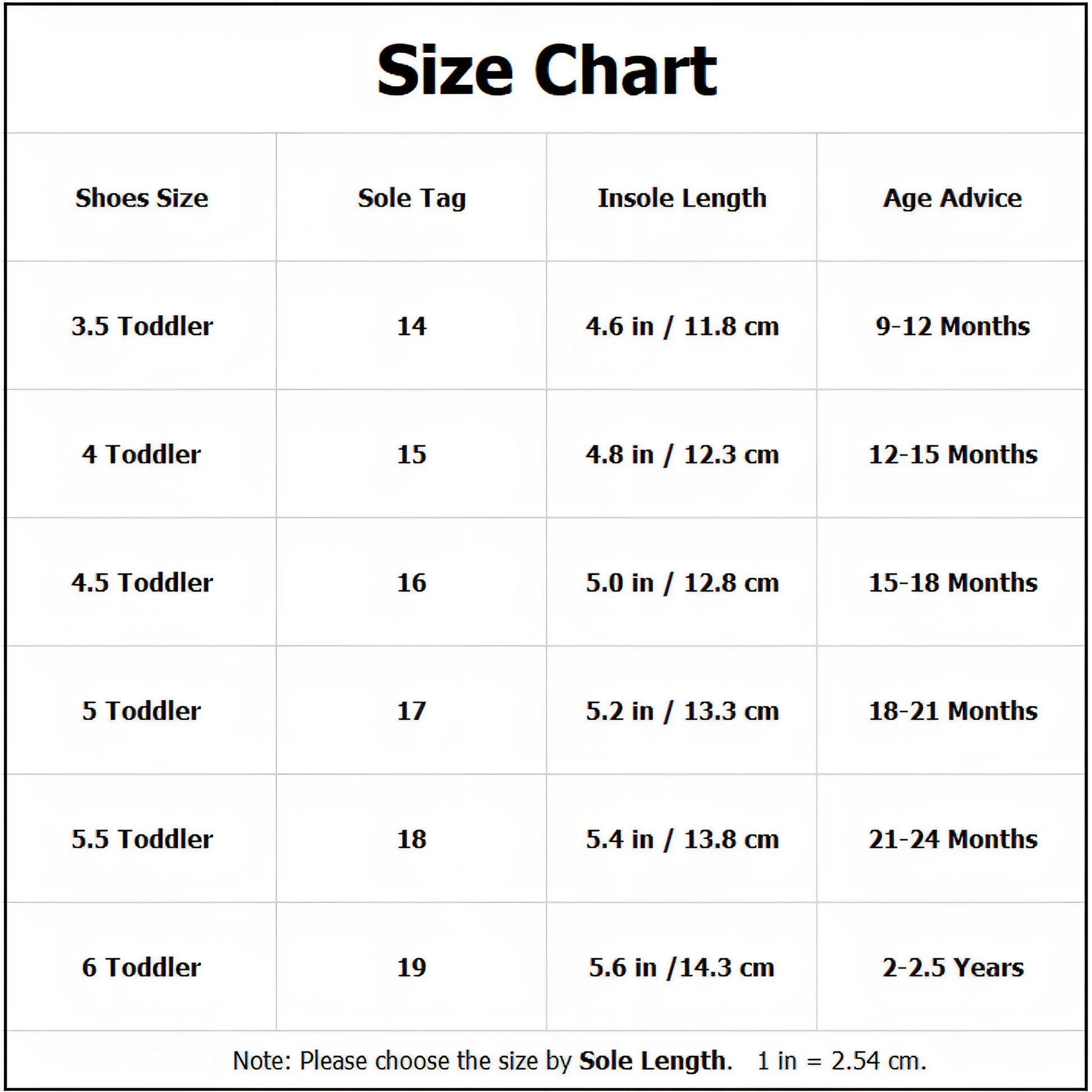 - Size Reference: 3.5 Toddler, Sole Tag 14, Insole Length-4.6 in/11.8 cm, Fit for 9-12 Months; 4 Toddler, Sole Tag 15, Insole Length-4.8 in/12.3 cm, Fit for 12-15 Months; 4.5 Toddler, Sole Tag 16, Insole Length-5.0 in/12.8 cm, Fit for 15-18 Months; 5 Toddler, Sole Tag 17, Insole Length-5.2 in/13.3 cm, Fit for 18-21 Months; 5.5 Toddler, Sole Tag 18, Insole Length-5.4 in/13.8 cm, Fit for 21-24 Months; 6 Toddler, Sole Tag 19, Insole Length-5.6 in/14.3 cm, Fit for 2-2.5 Years.