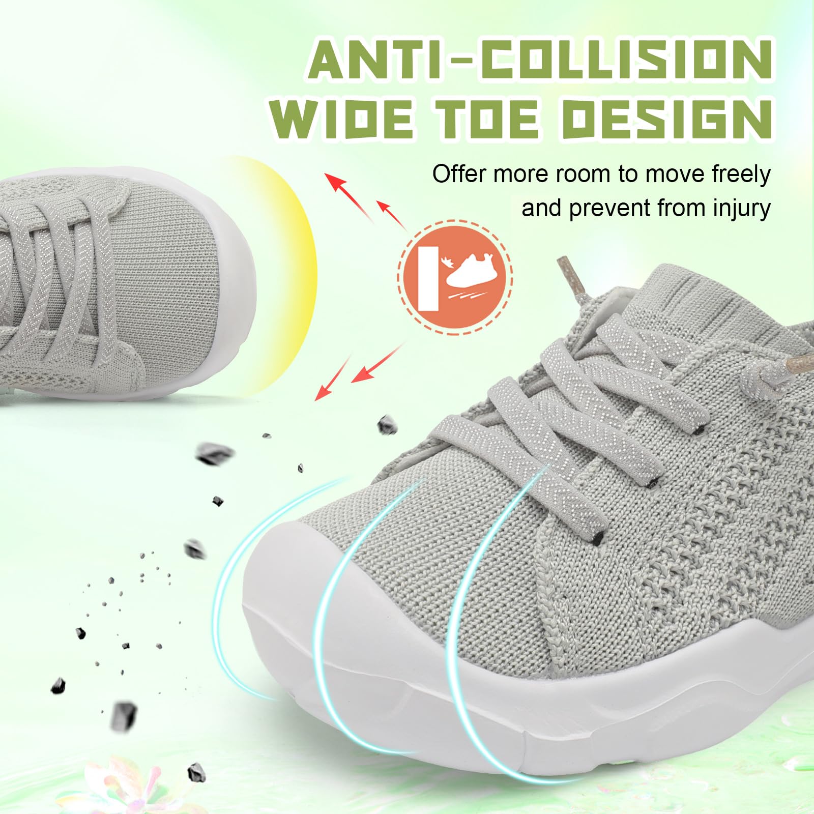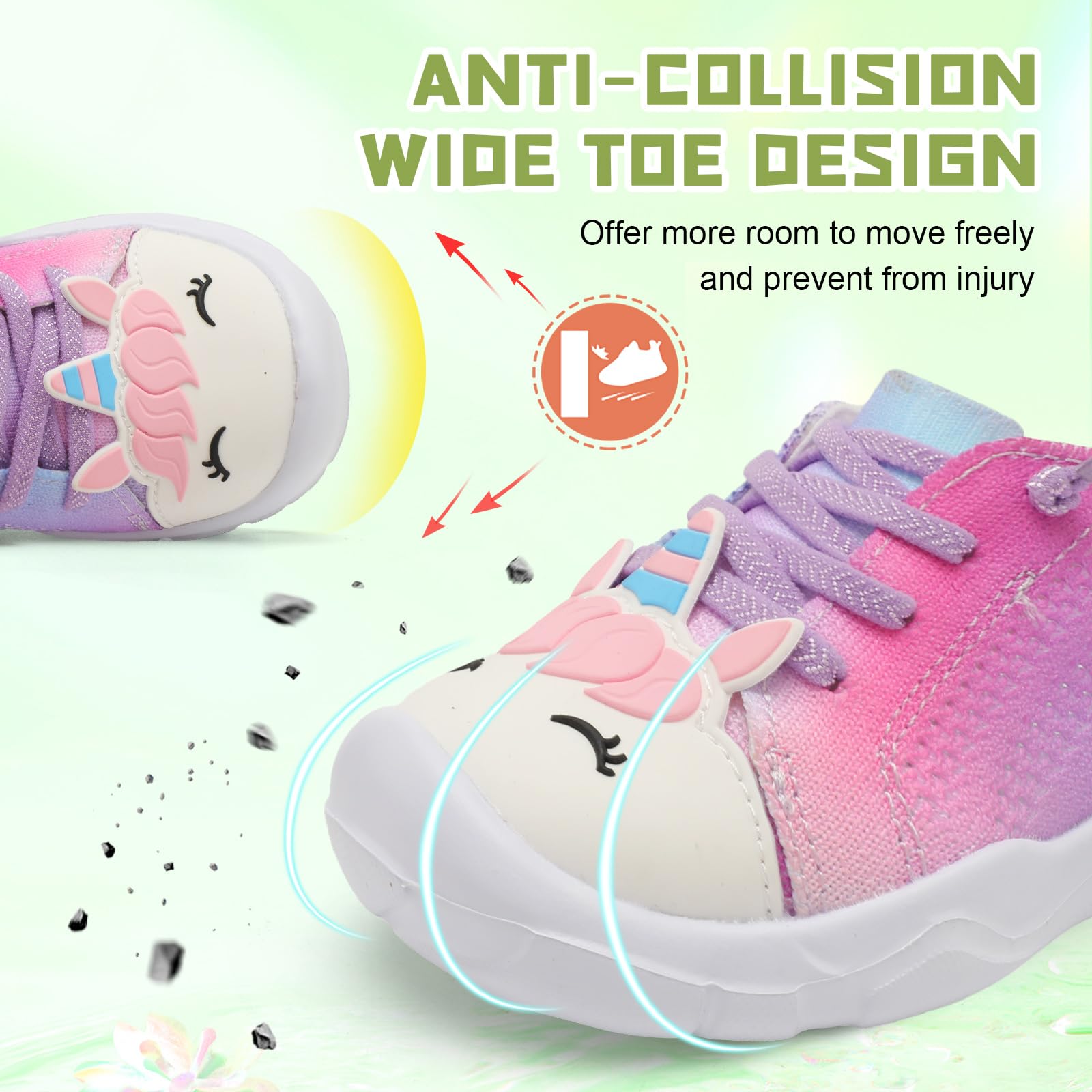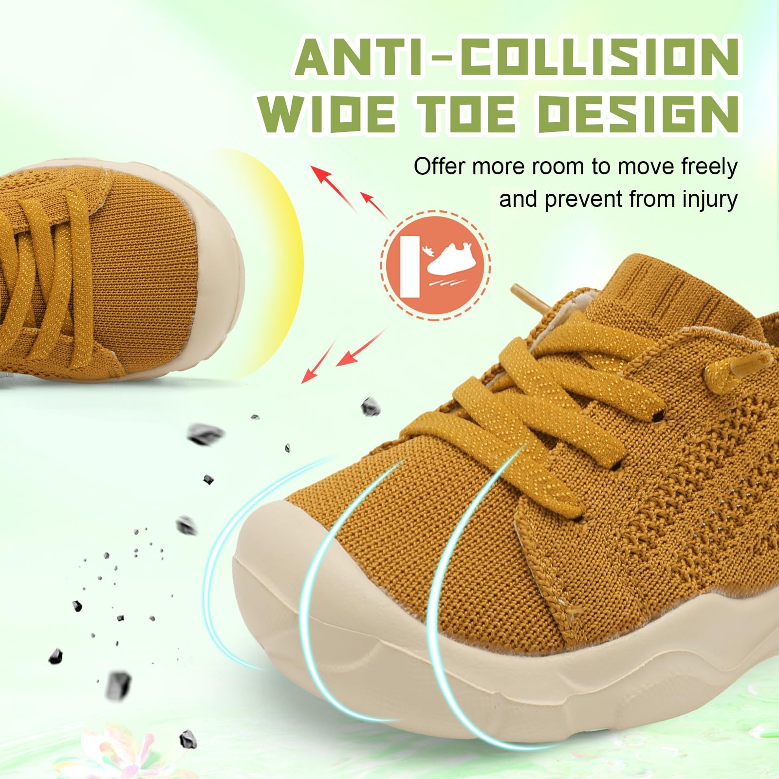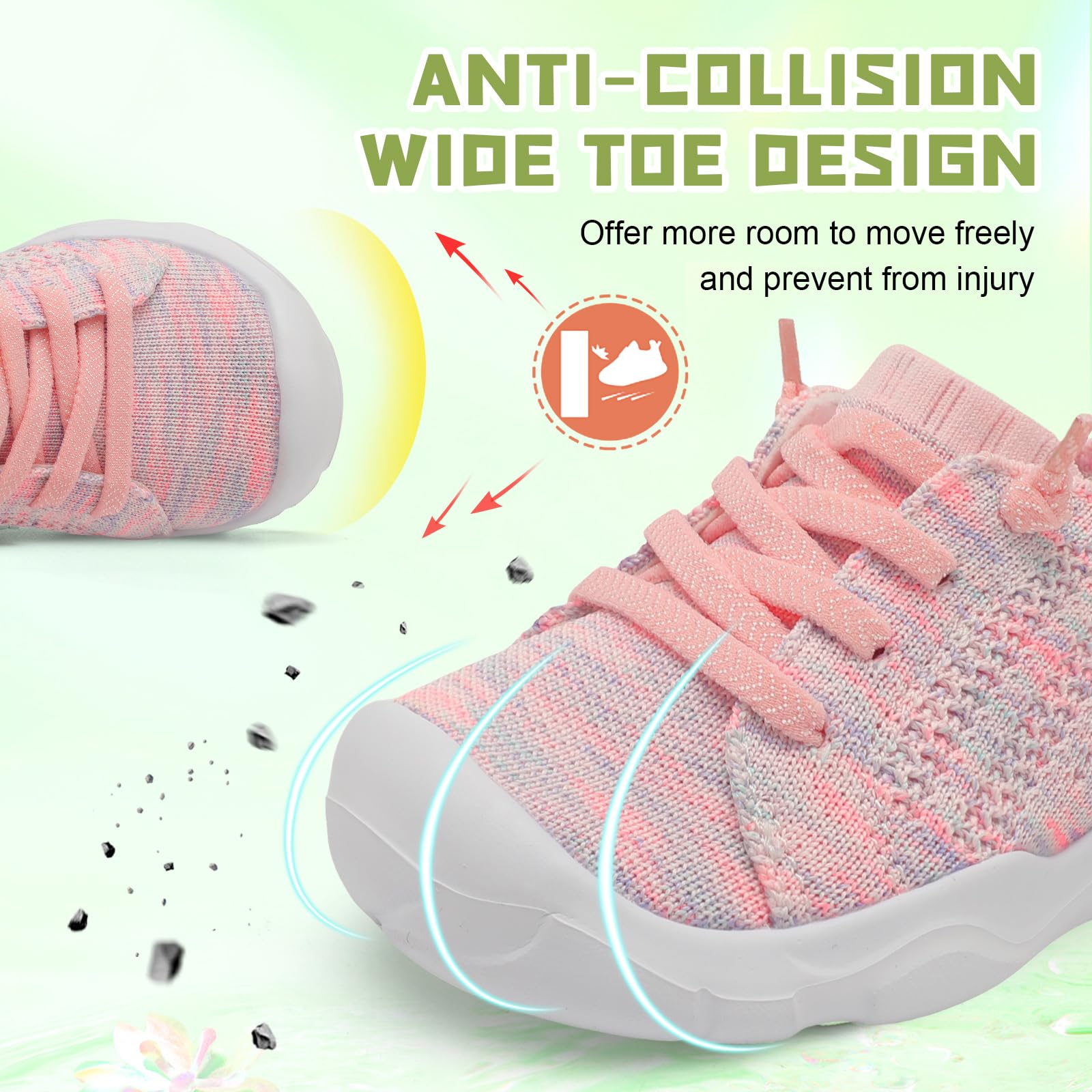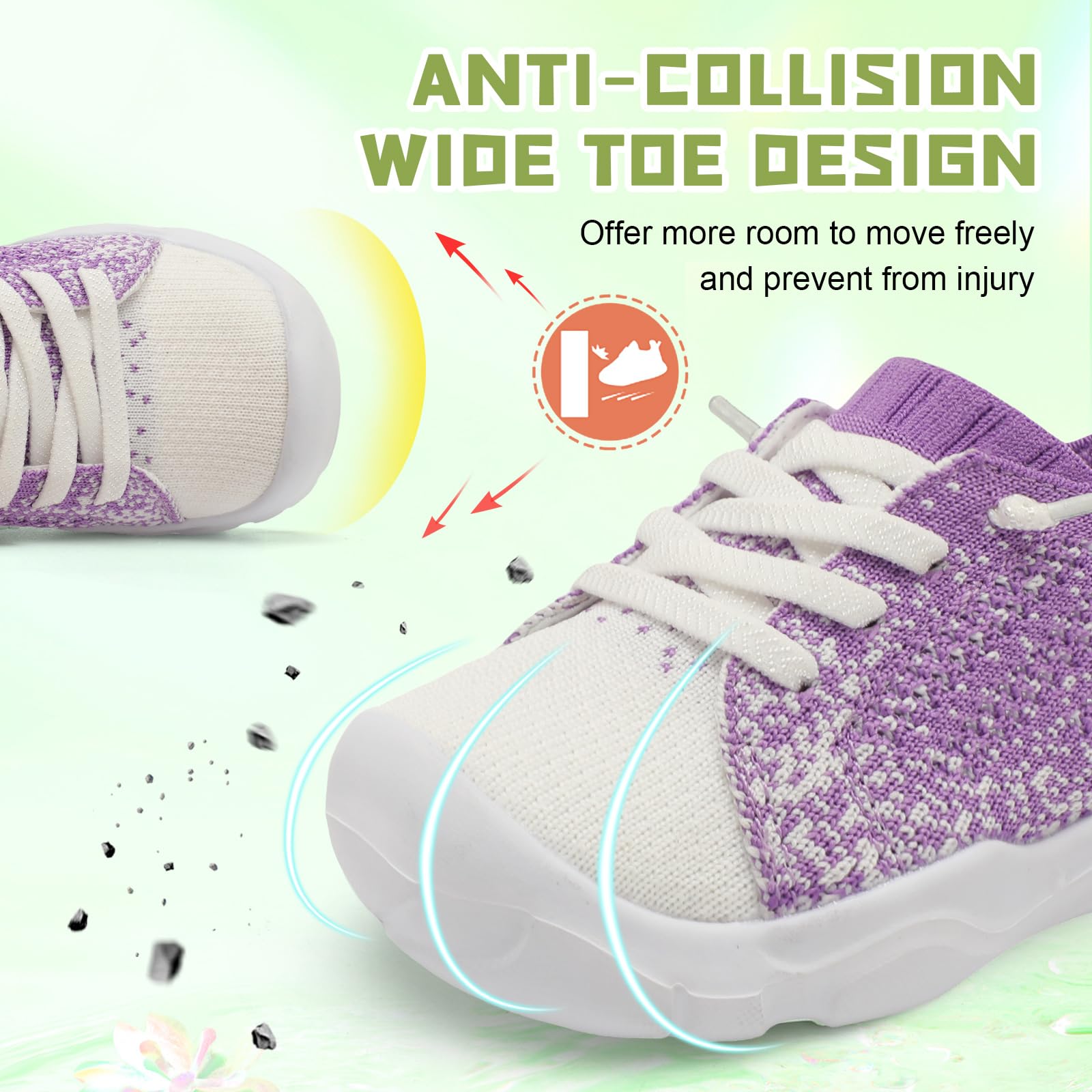 - Wide and Anti-collision:Toddler Walking Shoes with wide toe box and anti-collision toe caps give toddler’s toe more room to move freely without being squeezed and protect from injury