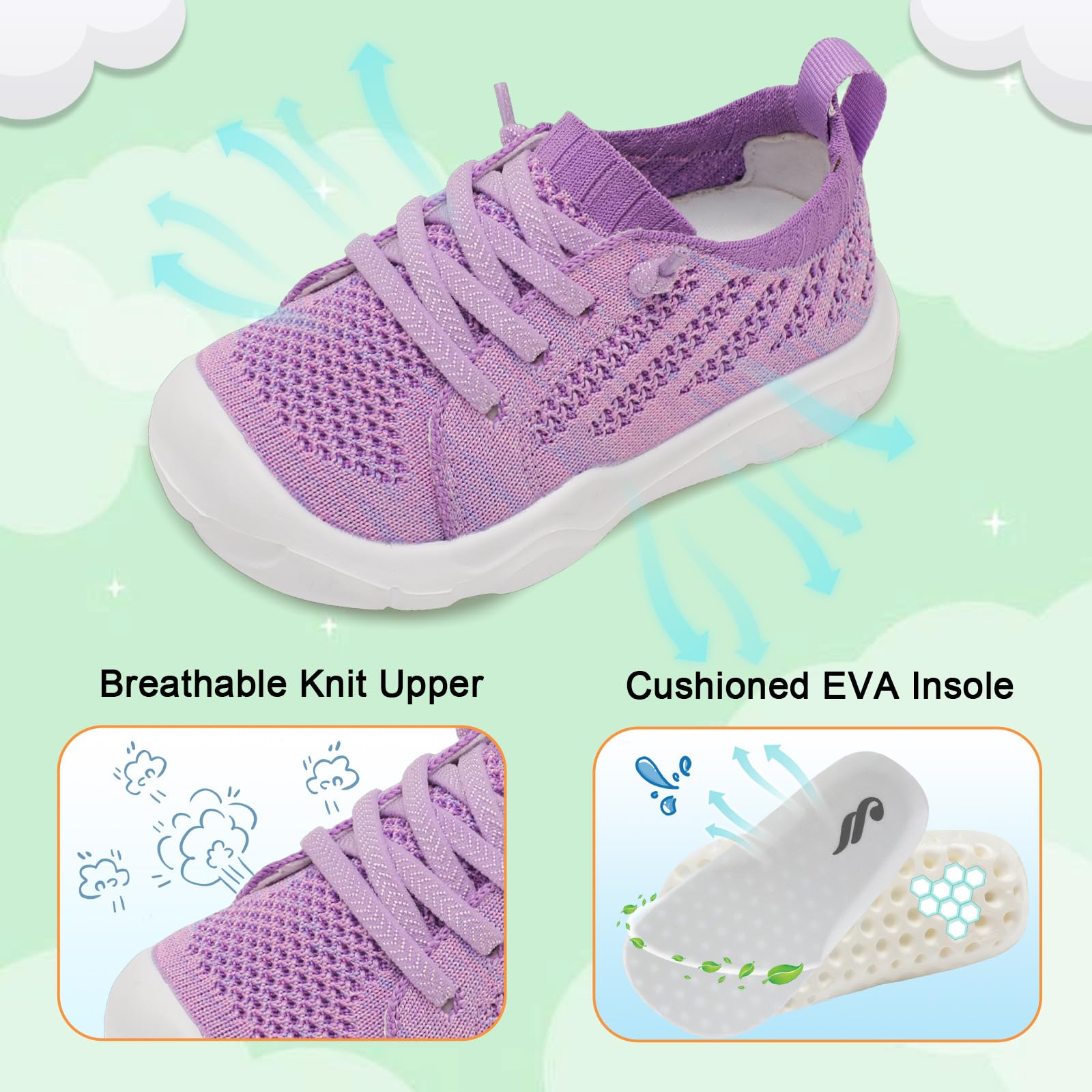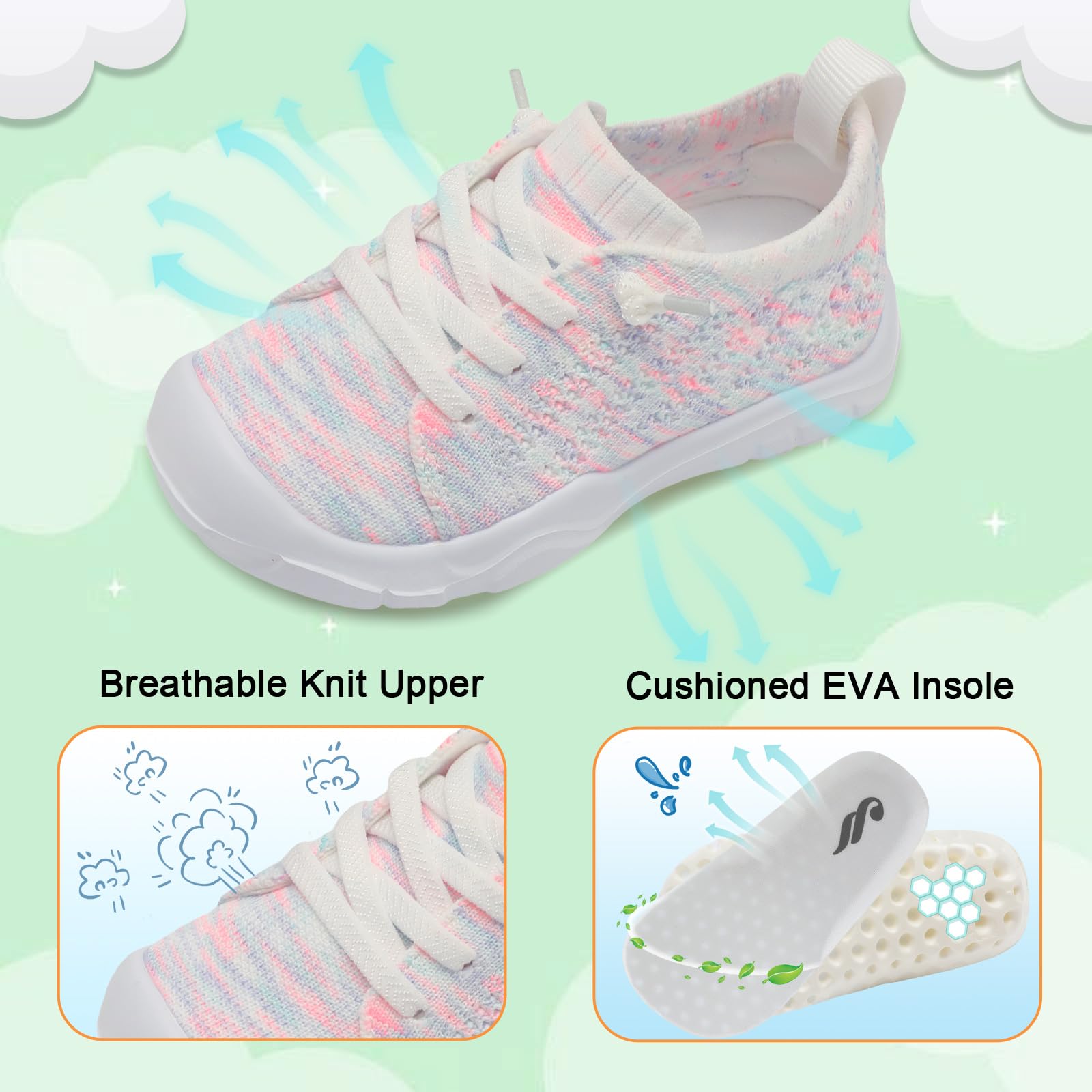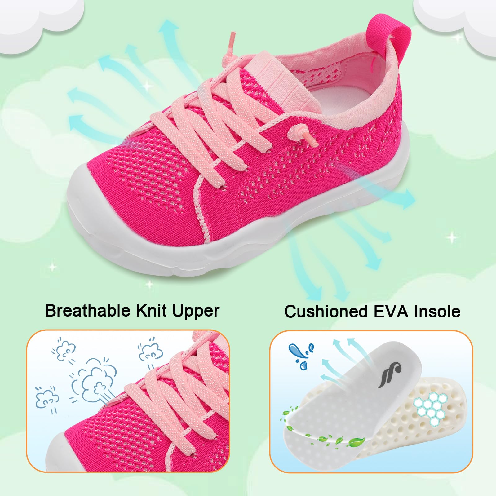 - Lightweight and Breathable:Toddler Sneakers are made of ultra lightweight materials offers more comfort and less burden. Friendly knit Upper keep feet dry and snug during walking or running