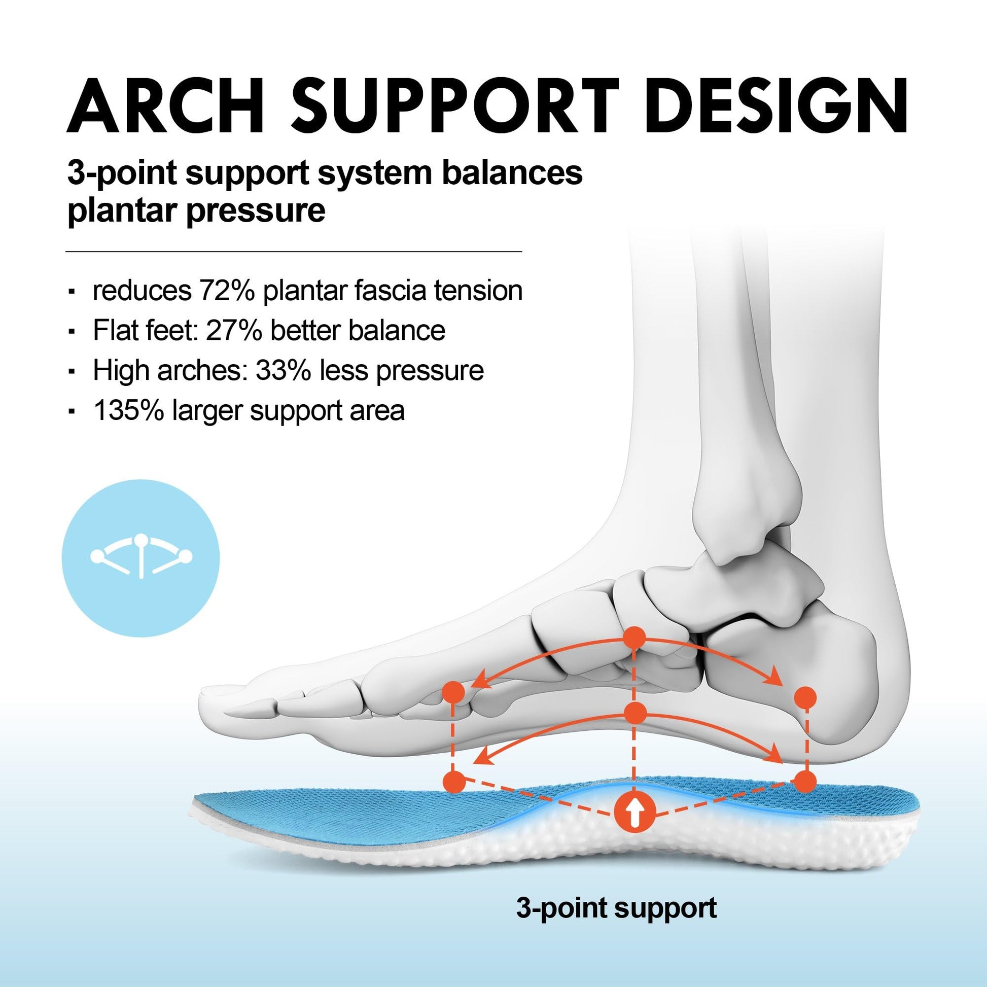 - 3D Arch Support for All-Day Endurance: 135% arch coverage disperses 72% plantar tension. Tri-support structure improves flat foot balance by 27% and relieves high arch by 33%. Walk 20,000 steps daily with fatigue-defying stability—your arches deserve this smart cradle.