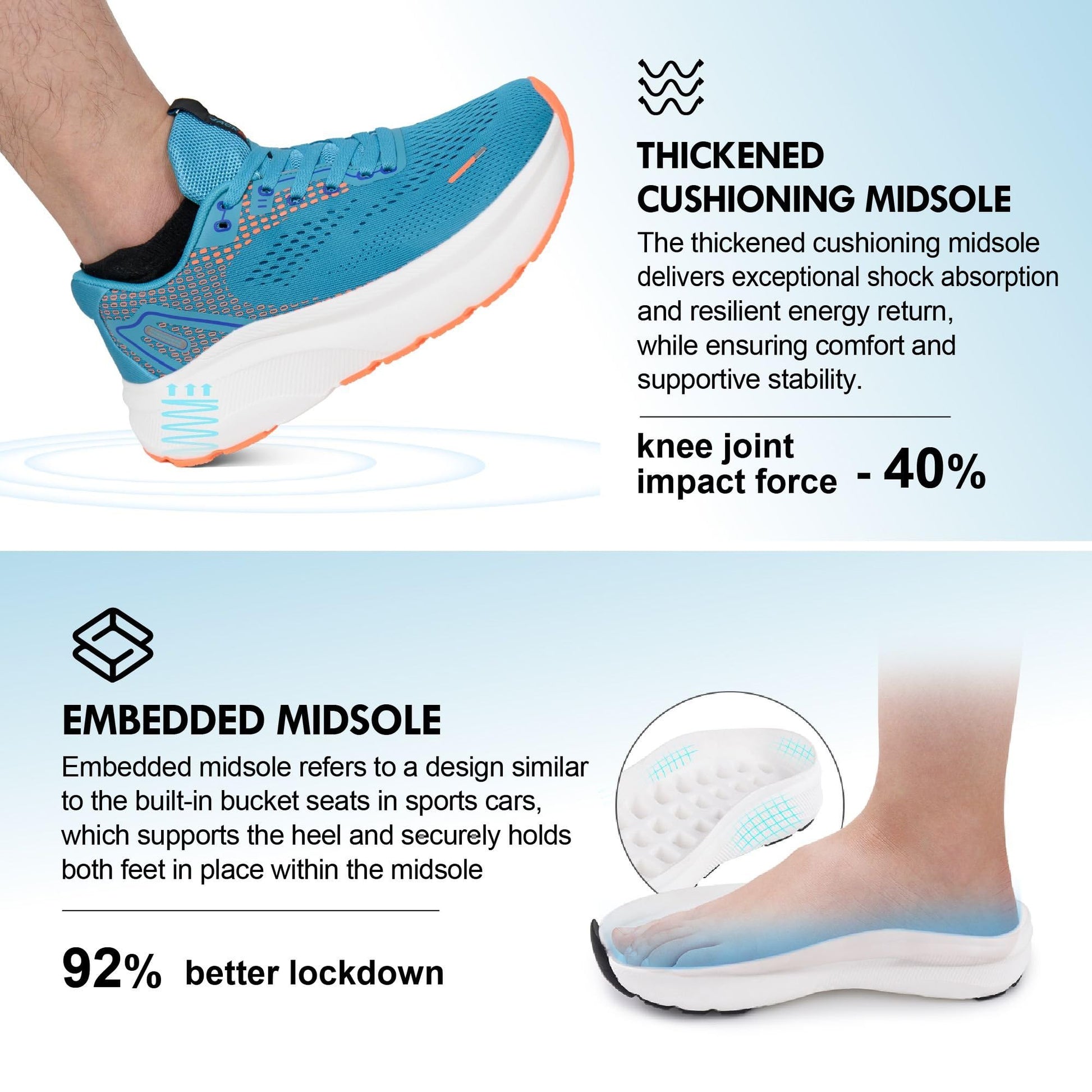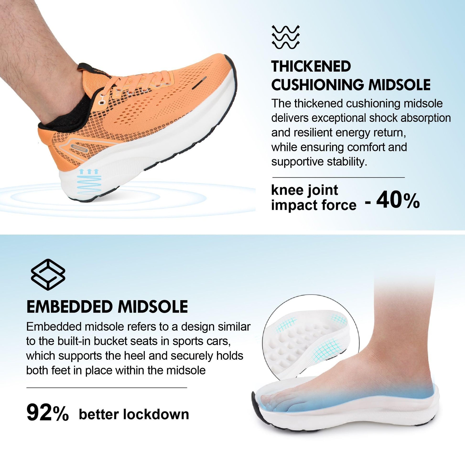 - Thickening Cushioned Midsole: Roller Propulsion Tech for Effortless Comfort. 1.57" foam midsole absorbs 40% joint stress, paired with 15°toe rocker saving 17% leg effort. Patented roller tech mimics energy return, turning commutes into cloud-like glides. Walk 5km with 58% less knee strain—hardcore cushion meets smart propulsion.