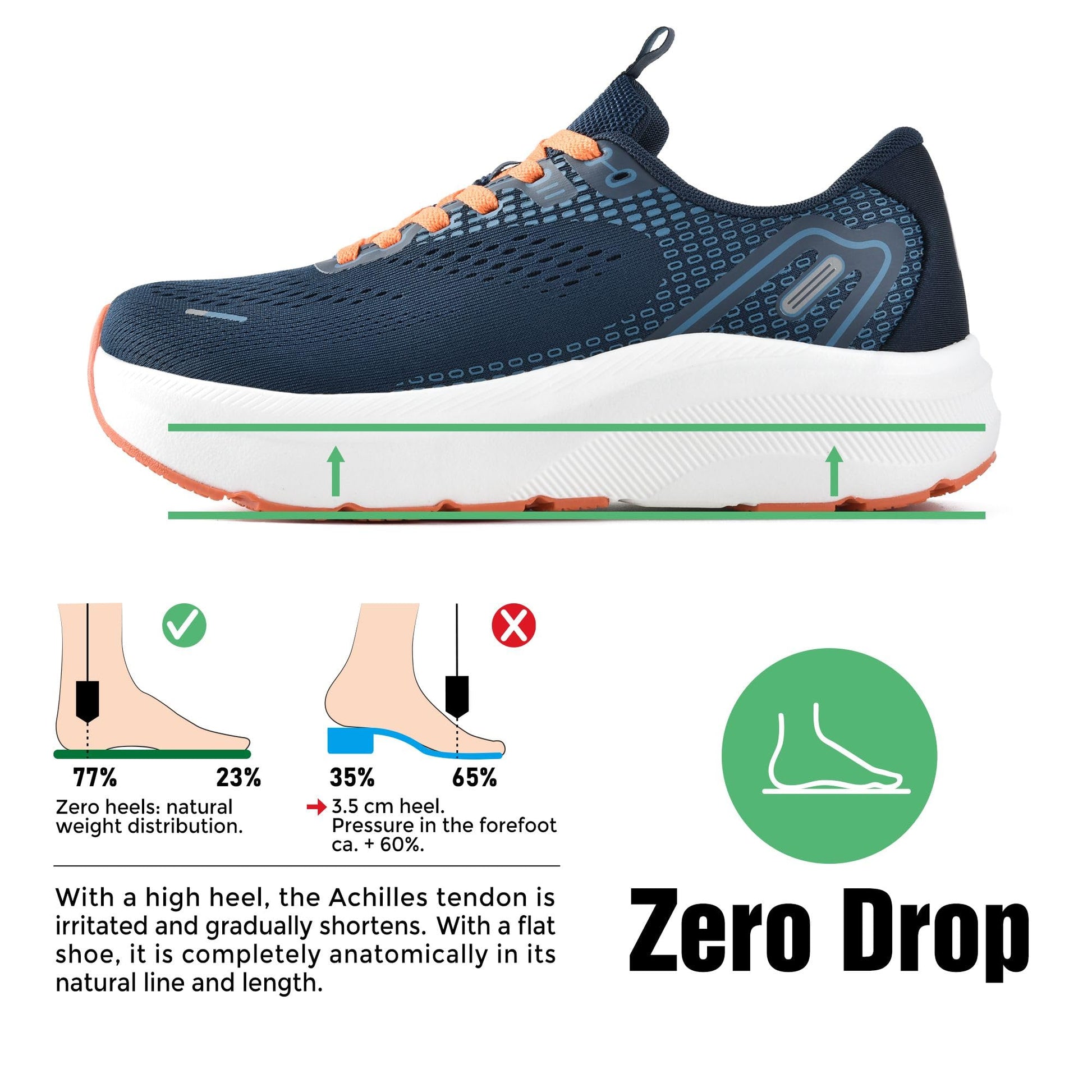 - Wide Toe Box: Zero Drop Platform for Natural Stride. Zero toe compression in 8-hour wear! 20% wider forefoot reduces pressure by 63%, while 0mm heel-to-toe drop cuts 42% knee impact. Anatomical design mimics barefoot freedom, restoring natural gait mechanics. Ideal for prolonged standing/walking—let your toes breathe and joints thrive.